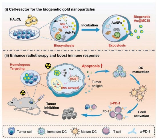 - Qin, X.; Yang, C.; Xu, H.; Zhang, R.; Zhang, D.; Tu, J.; Guo, Y.; Niu, B.; Kong, L.; Zhang, Z. Cell-derived biogenetic gold nanoparticles for sensitizing radiotherapy and boosting immune response against cancer. Small 2021, 17, e2103984. [Google Scholar] [CrossRef] [PubMed]