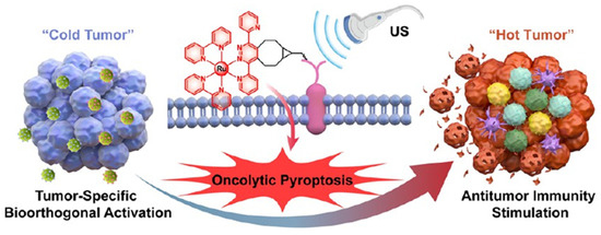 - Xu, X.; Zheng, J.; Liang, N.; Zhang, X.; Shabiti, S.; Wang, Z.; Yu, S.; Pan, Z.Y.; Li, W.; Cai, L. Bioorthogonal/ultrasound activated oncolytic pyroptosis amplifies in situ tumor vaccination for boosting antitumor immunity. ACS Nano 2024, 18, 9413–9430. [Google Scholar] [CrossRef] [PubMed]