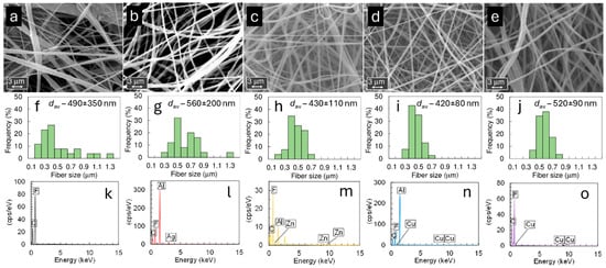 SEM images (a–e), fiber diameter distribution graphs (f–j), and SEM-EDX spectra (k–o) are presented for electrospun filter materials prepared from a 28 wt% PVDF + DMA solution at 9 kV (a,f,k), and with the addition of 2.0 wt% AgNO3 at 15 kV (b,g,l), 2.0 wt% ZnCl2 at 15 kV (c,h,m), 0.25 wt% Cu(NO3)2·2.5H2O at 17 kV (d,i,n), and 3.5 wt% Cu(NO3)2·2.5H2O at 17 kV (e,j,o). Scale bars are included on the SEM images (a–e).