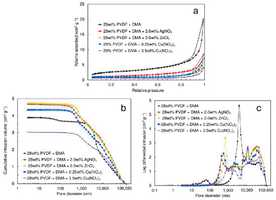 (a) Nitrogen sorption isotherms (adsorption—filled marks; desorption—open marks), (b) mercury intrusion curves, and (c) pore size distribution graphs derived from mercury porosimetry data for electrospun filter materials produced from a 28 wt% PVDF + DMA solution at 9 kV, as well as those with added 2.0 wt% AgNO3 at 15 kV, 2.0 wt% ZnCl2 at 15 kV, 0.25 wt% Cu(NO3)2·2.5H2O at 17 kV, and 3.5 wt% Cu(NO3)2·2.5H2O at 17 kV.