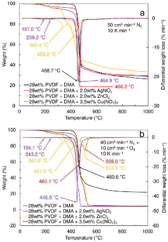 Thermogravimetric analysis (weight loss—solid line, differential weight loss—dotted lines) in (a) nitrogen and (b) synthetic air (mixture of 20 vol% oxygen and 80 vol% nitrogen) for different electrospun filter materials fabricated using the solutions of 28 wt% PVDF + DMA at voltage 9 kV, and with the addition of 2.0 wt% AgNO3 at 15 kV, 2.0 wt% ZnCl2 at 15 kV, and 3.5 wt% Cu(NO3)2·2.5H2O at 17 kV.