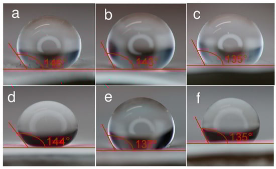 The hydrophilicity of the surfaces [,,] was measured with the contact angle method (Figure 4). A droplet of ultrapure water (10 μL) was carefully dripped onto the surfaces of different membranes. Three measurements for the same membrane material revealed minimal variation (±1°) in the contact angle values. The largest contact angle recorded was 146 ± 2° for the non-activated filter, making it the most hydrophobic of the filter materials tested. The contact angle values for different activated materials varied: 135 ± 2°, 137 ± 2°, and 144 ± 2° for filter materials with 3.5 wt%, 2.0 wt%, and 0.25 wt% Cu(NO3)2·2.5H2O (Figure 4d–f). The contact angles for membranes containing 2.0 wt% ZnCl2 and 2.0 wt% AgNO3 in the spinning solution were 135 ± 2° and 143 ± 2°. These results indicate that all surfaces measured were relatively hydrophobic, i.e., poorly wetting. However, the addition of metal nanoclusters makes fibers slightly more hydrophilic. This is particularly true when membranes are spun from solutions containing 2.0 wt% ZnCl2 and 3.5 wt% Cu(NO3)2·2.5H2O.