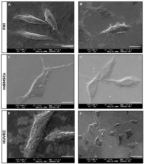 In the FN1 cell cultures (Figure 2A,B), cells displayed an elongated morphology with fine cytoplasmic extensions and irregular surfaces, consistent with active extracellular matrix synthesis. mBMSCs (Figure 2C,D) exhibited notable clustering behavior and pronounced intercellular junctions, indicative of regenerative signaling. HUVECs (Figure 2E,F) retained their characteristic cobblestone morphology, showing increased contact and membrane projections.