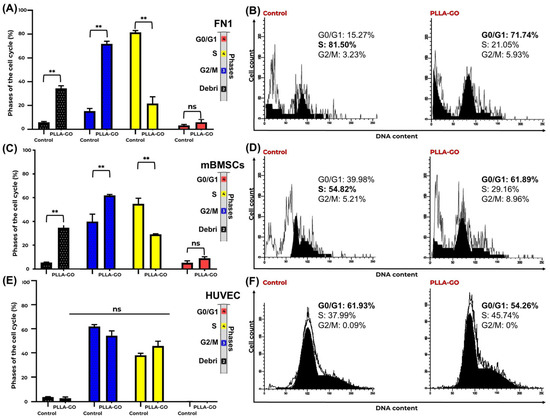 In contrast to the FN1 cells and mBMSCs, HUVECs showed no significant alteration in their cell cycle distribution following PLLA-GO exposure. Both groups maintained their primary distribution across the G0/G1 and S phases, with minimal presence in G2/M, and no significant differences were found between control and treated groups for any cell cycle phase (p ≥ 0.05) or in the proportion of debris (Table 2, Figure 3E,F).