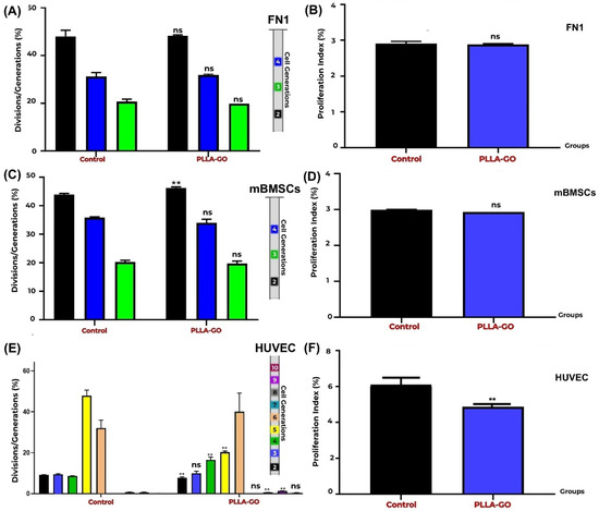 Proliferation analysis of FN1 cells, mBMSCs, and HUVECs by CFSE. Generation Tracking Comparative bar graphs show the percentage of FN1 cells (A), mBMSCs (C), and HUVECs (E) across different generations (FN1: 2nd–4th; mBMSCs: 2nd–4th; HUVECs: 2nd–10th) in both control and PLLA-GO groups. For FN1 cells, there was no significant difference between the groups in any of the analyzed generations (p ≥ 0.05) (A). In mBMSCs, a significant increase in the percentage of cells in the 2nd generation was observed in the PLLA-GO group (p ≤ 0.05), with no significant differences in the other generations (B). For HUVECs, the PLLA-GO group showed significant differences in the percentage of cells across various generations, including a decrease in initial generations and an accumulation in more advanced generations, with the absence of the 7th generation (p ≤ 0.05) (E). The cellular proliferation index for the FN1 cells (B), mBMSCs (D), and HUVECs (E) in the control and PLLA-GO groups was also assessed. In panels B, D, and F, black bars represent the Control group and blue bars represent the PLLA-GO group. There was no significant difference in the proliferation index for the FN1 cells and mBMSCs between the groups (p ≥ 0.05) (B,D). However, HUVECs exposed to PLLA-GO presented a significant decrease in the cellular proliferation index (p ≤ 0.05) (F). Error bars represent the standard deviation. “ns” indicates no statistically significant difference (p ≥ 0.05), and asterisks (**) indicate statistically significant differences (p ≤ 0.05).