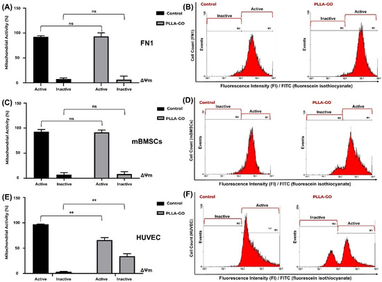 Analysis of mitochondrial electrochemical potential (ΔΨm) in FN1 cells, mBMSCs, and HUVECs in response to PLLA-GO nanocomposite. Comparative bar graphs illustrate the percentage of cells with active and inactive mitochondrial potential in the control and PLLA-GO groups for the FN1 cells (A), mBMSCs (C), and HUVECs (E). FN1 cells and mBMSCs predominantly maintained an active ΔΨm in both control and PLLA-GO groups, with no statistically significant differences (p ≥ 0.05). In contrast, HUVECs exposed to PLLA-GO showed a significant reduction in the percentage of cells with active mitochondrial potential and a substantial increase in cells with inactive potential (p ≤ 0.05). Representative histograms of FITC dye fluorescence intensity (FI) indicate the distribution of cells with active and inactive mitochondrial potential in control and PLLA-GO groups for the FN1 cells (B), mBMSCs (D), and HUVECs (F). Region M1 represents cells with active mitochondrial potential (high fluorescence, indicative of polarized mitochondria), while region M2 corresponds to cells with inactive mitochondrial potential (low fluorescence, reduced ΔΨm). The histograms demonstrate the maintenance of active potential for FN1 cells and mBMSCs, and a clear transition to the inactive state in HUVECs with PLLA-GO. “ns” indicates no statistically significant difference (p ≥ 0.05); asterisks (**) indicate statistically significant differences (p ≤ 0.05).