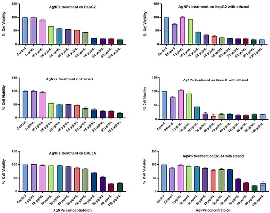 Cell viability study of green AgNPs on cell lines, HepG2, Caco-2, and BRL3A. Cell viability was studied for AgNPs alone and in combination with 0.2 M ethanol. Statistical analysis: data are presented as the mean ± SD (n = 3).