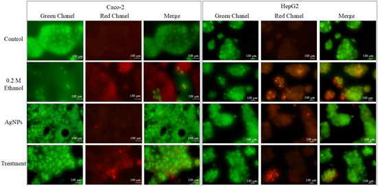 Acridine orange (AO) and ethidium bromide (EtBr) dual staining was employed to assess cell death, nuclear morphological changes, and the formation of apoptotic bodies. The same number of HepG2 and Caco-2 cells as used in previous assays were seeded into 96-well plates. Once the cells reached 40–50% confluency, they were treated with 0.2 M ethanol, AgNPs alone, or a combination of ethanol and AgNPs. After 24 h of treatment, the cells were washed with phosphate-buffered saline (PBS) and stained with a 100 µg/mL AO/EB solution. The stained cells were immediately visualized under a fluorescence inverted microscope (Nikon Eclipse 3000, Tokyo, Japan) using FITC and TRITC filters. Live cells with intact membranes appeared green under merged channel imaging. Cells showing chromatin condensation (dense green nuclei) indicated early apoptosis, while those with compromised membrane integrity fluoresced red, signifying late apoptosis or necrotic cell death [16].