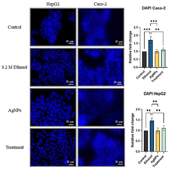 HepG2 and Caco-2 cells were seeded into 96-well plates at a density of 20,000–25,000 and 11,000–15,000 cells per well, respectively. After reaching the appropriate confluency, the cells were treated with 0.2 M ethanol and 1 µg/mL of AgNPs, followed by incubation for 24 h. After treatment, the cells were gently washed with 1X phosphate-buffered saline (PBS) and fixed using 4% formaldehyde. Residual fixative was removed in subsequent washes with distilled water and PBS. The cells were then stained with 100 µM DAPI in the dark for 15 min. Following staining, excess DAPI was removed by washing with PBS. Fluorescence imaging was performed using a fluorescence microscope, and the emission intensity was quantified using a multimode reader (PerkinElmer, Waltham, MA, USA) at an excitation wavelength of 385 nm. Fold change in fluorescence intensity was calculated relative to untreated control cells [15].