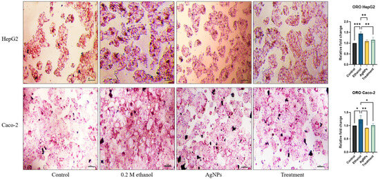 ORO staining to assess intracellular lipid accumulation in HepG2 and Caco-2 cells. Cells were treated with 0.2 M ethanol, AgNPs (1 µg/mL), or a combination of both (treatment) and compared to untreated controls. Ethanol-treated cells exhibited significant lipid accumulation, evident as dense, red-stained droplets in the cytoplasm. AgNPs alone did not alter lipid levels compared to the control, while co-treatment with AgNPs reduced ethanol-induced lipid accumulation. The image was taken in a bright field microscope with a resolution of 10 µM. Statistical analysis: data are presented as the mean ± SD, one-way ANOVA with Dunnett’s post hoc test; compared to the ethanol group, where * p <0.05, **p < 0.01, *** p < 0.001.