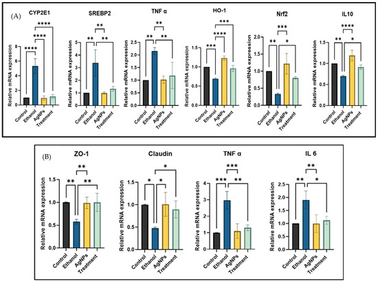 Ethanol exposure in HepG2 cells resulted in a significant upregulation of CYP2E1 expression, showing nearly a fivefold increase compared to control cells. However, co-treatment with AgNPs markedly reduced CYP2E1 expression levels. As CYP2E1 plays a key role in generating ROS and activating lipogenic transcription factors such as SREBP1c, its reduction suggests a protective effect. Similarly, SREBP2, which regulates de novo lipogenesis, was upregulated in ethanol-treated cells but downregulated after the AgNPs treatment. Ethanol-induced oxidative stress also led to the suppression of antioxidant markers such as Nrf2 and HO-1, both of which were restored upon AgNPs co-treatment, indicating a re-establishment of the redox balance. Furthermore, ethanol triggered an increase in pro-inflammatory cytokines and a concurrent decrease in the anti-inflammatory cytokine IL-10. The AgNPs treatment reversed this trend, enhancing IL-10 expression and supporting the restoration of anti-inflammatory homeostasis (Figure 9A).
