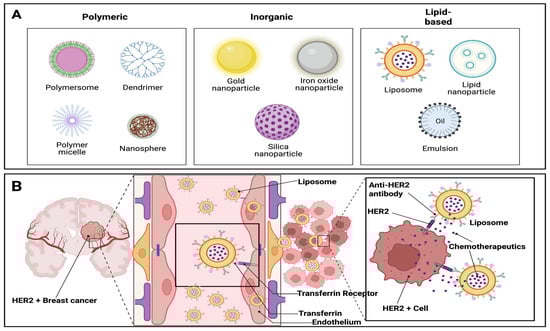 Classification and Mechanism of Nanoparticles: (A) illustrates three different types of NP: (1) polymeric (e.g., polymersomes, dendrimers), (2) inorganic (e.g., gold, iron oxide), and (3) lipid-based (e.g., liposomes, emulsions), each offering unique properties for drug delivery. (B) illustrates the mechanism by which liposomal NPs deliver chemotherapeutics across the BBB to target HER2-positive breast cancer metastases in the brain. Liposomes are engineered to interact with transferrin receptors expressed on the endothelial cells of the BBB, facilitating receptor-mediated transcytosis. After crossing the BBB, the liposomes accumulate in the tumor microenvironment and specifically bind to HER2-expressing cancer cells through anti-HER2 antibodies conjugated to their surface. This targeted interaction allows for localized drug release into the tumor cells, thereby enhancing therapeutic efficacy while minimizing off-target toxicity and preserving healthy tissue.