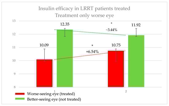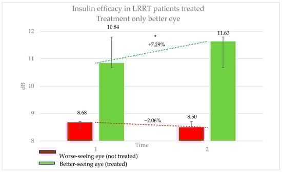 Efficacy of insulin treatment on the better eye in patients undergoing the Limoli Retinal Restoration Technique (LRRT). Change in retinal sensitivity in decibels (dB) measured by microperimetry (MY) in the better eye before and after insulin-enhanced injection. The results indicate a statistically significant improvement in sensitivity, highlighting the potential benefits of insulin treatment in neuroretinal degenerative conditions. Error bars represent the standard deviation. Asterisk (*) indicates statistical significance at p < 0.05. The statistically significant improvement in sensitivity may support the potential therapeutic effect of insulin in neuroretinal degenerations.