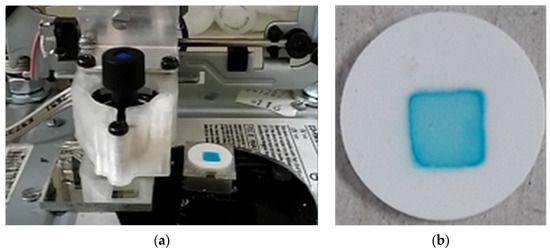 The device is operated by computer software developed for it. The print pattern can be adjusted to the right position on the substrate by the setting of vertical and horizontal displacement of the printhead. The ink solutions were filtered through a 0.22 µm pore size membrane filter (CHROMAFIL® Xtra PVDF, 0.22 µm, Macherey-Nagel GmbH & Co. KG, Dueren, Germany) prior to filling into the printer tank. Printing was performed through a single nozzle, using 110 dpi resolution and resulting in a square of 20 × 20 pixels (Figure 1b). Each ink composition was printed on substrates using three different amounts (e.g., 10, 50, and 90 drops/pixel). The pattern accuracy was then evaluated later qualitatively and quantitatively. The quantification of pattern accuracy was done with ImageJ 1.54g software (National Institute of Health, Bethesda, MD, USA) through the analysis of the area and solidity of the printed spot. The spot solidity can be calculated with the following Equation (3):