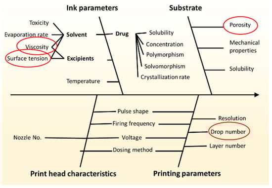 Ishikawa diagram of critical material attributes (CMAs) and critical process parameters (CPPs) for determining the quality of printed dosage forms.