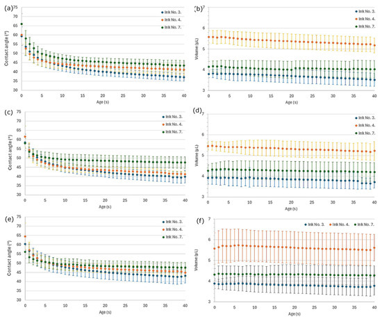 The values of the contact angle and volume of the ink droplet on the substrates were also monitored and then plotted as a function of time (Figure 3). As can be seen, the contact angle increased in order of ink 3, 4, and 7, which had viscosity values of 1, 2, and 3.5 mPas, respectively, which indicates that the increasing viscosity prevented spreading and helped to localize the droplet after printing. In the case of drop volume, a higher volume was detected in the case of ink 4, which had the highest surface tension (Table 5)—the result indicates that this parameter has a more considerable effect on drop size than viscosity. Observing the same solutions on different substrates, it was found that a smaller drop volume was observed in the case of the substrate compressed at 165 MPa, which further decreased with time, indicating considerable penetration of the ink into the substrate due to its higher porosity. In such cases, the decreasing contact angle may be connected more to penetration than to spreading.