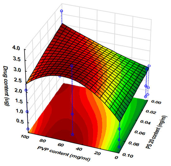 The fit of the second-degree polynomial (R2 = 0.9224) was adequate to draw reliable conclusions. When examining the effects of the factors, the positive sign of the coefficients of significant (p < 0.05) effect indicates that the drug content increased with increasing levels of both the drop number applied per point (x3) and PVP content (x1), while the PS content (x2) had a neglectable effect on this parameter. The increasing PVP content, and hence increasing viscosity, increased the drug content through the increment of the droplet volume. This increment was found to be linear at low PS levels, where the high surface tension of the ink further improved the reachable drop volume (Figure 4). However, as is indicated by the significant (p < 0.05) interaction between the exponential component of the PVP content and the linear component of the PS content, the size and volume of droplets decreased due to the decreasing surface tension (Figure 3), and interestingly, this effect was bigger at higher viscosity values (Figure 4), which may have been due in that case to the surface tension not withstanding the increasing weight of the liquid as it accelerated the dripping and thus decreased the available drug content.