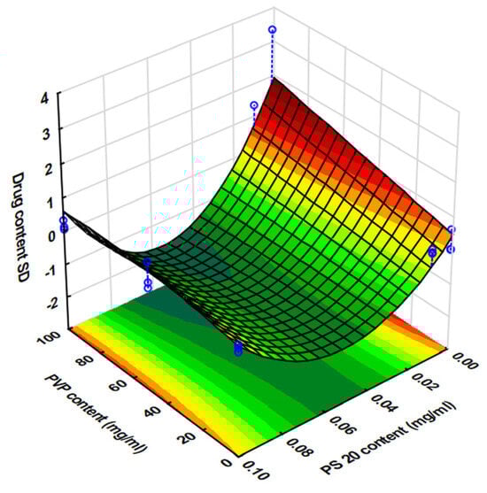 Nevertheless, it is clearly visible from the data (Table 6) that the increment of drug content was not in direct proportion with the increment of drop number, which may be due to inaccuracies in the working of the printhead. When examining the dosing accuracy through the analysis of the standard deviation of the drug content, a rather poor model fit was observed in the statistical evaluation Equation (6). The value of R2 (adj R2 = 0.0942) computed by the software is very low. This may be because the statistical software approximates the nonlinear effects with a parabolic function, which cannot cover the strong nonlinear effect of the PS content due to its logarithmic scaling (Figure 5).