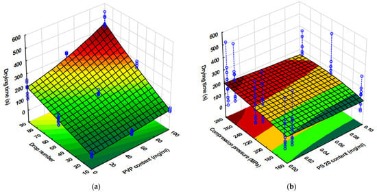 The fit of the model was adequate in this case to carry out the detailed analysis. It can be clearly seen that the linear effect of all the factors was found to be significant on this CQA, but only the PVP content exerted significant effect on the quadratic level. Similarly to the drug content, the number of printed droplets exerted the highest effect on the drying time both as a single factor and in first-order interaction with the PVP content and the applied compression force. This could obviously have been due to the increasing amount of liquid administered. The higher PVP content further increases the volume of droplets due to higher viscosity, which has an additional effect and increases the exponential increase in drying time at high drop numbers. The increased compression force increases the drying time through the prevention of liquid penetration into the substrate due to decreased porosity. The only factor that had a reducing effect on the drying time was the PS content used to reduce the surface tension, as it facilitated solvent evaporation by reducing the air/liquid interface tension and facilitating the ink’s penetration into the substrate.