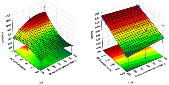 It is clearly visible that the PVP content exerted the highest influence on the spot size, followed by the compression pressure. The interaction of these two parameters was also found to be significant. At low compression pressures, a minor change could be detected in the spot size if the PVP content and so the viscosity of the inks decreased, which may be due the higher porosity and rougher surface promoting ink permeation into the substrate instead of spreading on the surface of substrates. In contrast, at a high compression pressure, the increment in the spot size was exponential.