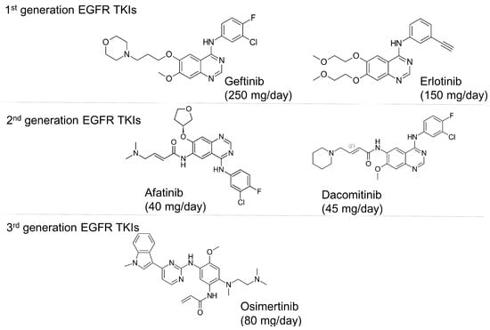 Chemical structures and recommended daily dosage of the US Food and Drug Administration (FDA)-approved EGFR TKIs.