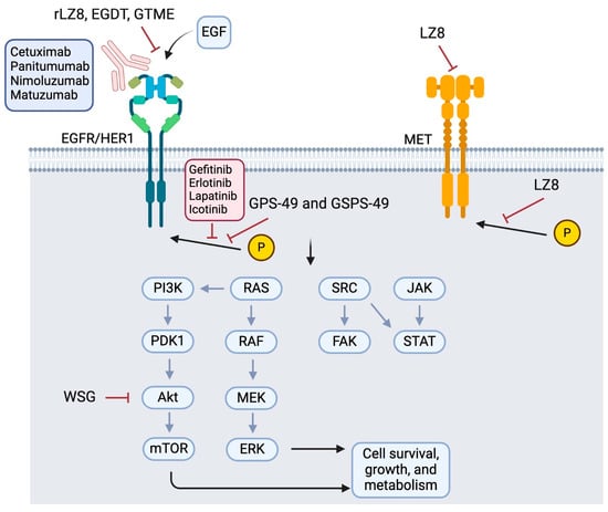 Reported molecular targets of Lingzhi in the EGFR signaling pathway. Abbreviations: rLZ8: recombinant Ling Zhi-8 (a protein isolated from Ganoderma lucidum); EGDT: Ergosta-7,22-diene-2β,3α,9α-triol (a sterol); GTME: G. tsugae methanol extract; GPS-49 and GSPS-49: Ganoderma lucidum polysaccharides or sulfated polysaccharides isolated on day 49; WSG: a water-soluble glucose-enriched polysaccharide from Ganoderma lucidum; LZ-8: a medicinal peptide of Lingzhi.
