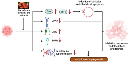 Angiogenesis supports tumor growth and progression by providing the oxygen and nutrients needed by rapidly growing cancer cells. Vascular endothelial growth factor (VEGF) represents the major angiogenesis inducer, facilitating the development of tumor vasculature. To this end, Lingzhi and Yunzhi have been reported as natural VEGF inhibitors (Figure 3 and Table 2), targeting tumor angiogenesis through multiple mechanisms. Lingzhi inhibits angiogenesis by downregulating VEGF expression and secretion through the suppression of the EGFR and PI3K/AKT/mTOR pathways []. It also reduces endothelial cell proliferation and capillary formation, thereby limiting tumor vascularization and oxygen/nutrient supply, which are crucial for tumor survival and metastasis [,,,].