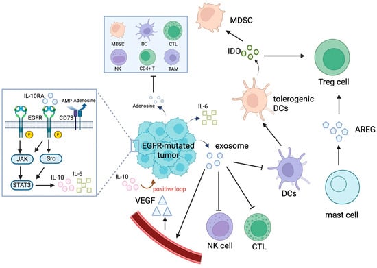 IL-6 and IL-10 are known to be upregulated in EGFR-mutated tumors with acquired resistance to TKIs [,]. These immunosuppressive cytokines impair antitumor immunity by promoting Treg and myeloid-derived suppressor cell (MDSC) recruitment and inhibiting T and NK cells. EGFR-mutated tumors with activated EGFR signaling are known to secrete VEGF, thereby promoting angiogenesis and creating an immunosuppressive TME [,]. Moreover, EGFR activation has been reported to synergize with TGF-β signaling to promote EMT and suppress T cell infiltration [,]. Furthermore, the overexpression of CD73 in EGFR-mutated tumors is known to increase adenosine levels, thereby suppressing CD8+ T cell and NK cell activity [,]. Recently, exosomes secreted from EGFR-mutated tumors were shown to contain oncogenic EGFR and various immunosuppressive factors, which induce the apoptosis of CD8+ T cells, impair DC function, and promote Treg development [,].