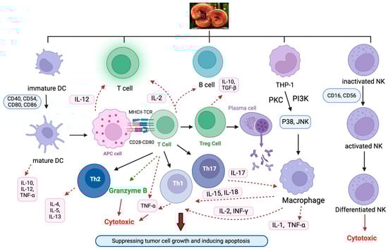 Lingzhi modulates cytokine production by promoting the release of pro-inflammatory cytokines while reducing immunosuppressive ones. Lingzhi polysaccharides (50–200 μg/mL) stimulated T lymphocytes to release IL-2 and IFN-γ, thereby enhancing T cell activation and cytotoxicity against tumor cells []. In tumor-bearing mice, Lingzhi extract (GLE; 200–400 mg/kg) was known to upregulate cytokines such as IFN-γ, IL-2, and TNF-α, thus producing T cell-mediated antitumor immunity []. Furthermore, Ganoderma lucidum polysaccharides (Gl-PS; at concentrations of 0.8, 3.2, and 12.8 µg/mL) have been reported to reduce the levels of two immunosuppressive cytokines (IL-10 and TGF-β1), which are often secreted by tumors to evade immune surveillance [,].