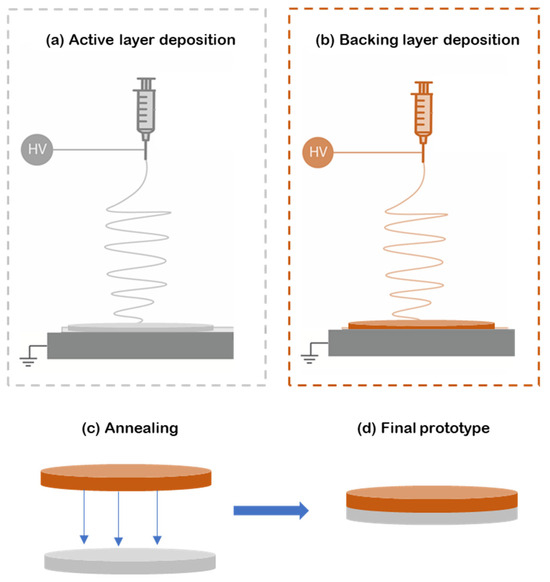 Diagram of the formulation of the multilayer patch. (a) Electrospinning of the active PEO-based layer (gray); (b) electrospun PCL backing layer produced separately from the previous layers (orange); (c) lamination at a low temperature by annealing the backing layer to the active layer; (d) final multilayer patch prototype. In this scheme HV means High Voltage.