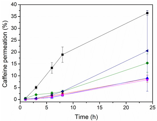 The release experiments were performed using Franz diffusion cell equipment at 35 °C with an effective diffusion area of 1 cm2. In the first experiment, a polyether sulfone membrane, Strat-M®, was placed between the donor and receptor chambers of the Franz diffusion cell. The permeation experiments with this synthetic membrane were performed in triplicate. To maintain the temperature of the receptor solution at 35 °C, a water jacket was connected to a water bath with continuously recirculating water. The patches were cut into pieces with a 1 cm2 effective surface and placed on top of the Strat-M membrane; then the assembly was mounted on the receptor chamber containing 8.0 mL of a PBS buffer solution (pH 7.4). The upper and lower parts of the Franz cell were sealed with parafilm and fastened together by means of a clamp. The in vitro caffeine permeation was monitored for different lengths of time: 1, 3, 6, 8 and 24 h. A certain amount of the solution, 0.5 mL, was withdrawn from the receptor chamber and then replaced with the same volume of the PBS solution (pH 7.4) to keep the sinking volume constant throughout the analysis. The caffeine concentration was determined using an HPLC Acquity® TQD (Waters, Milford, MA, USA) equipped with a C18 column (BEH, 1.7 µm, Waters) and a mass detector.
