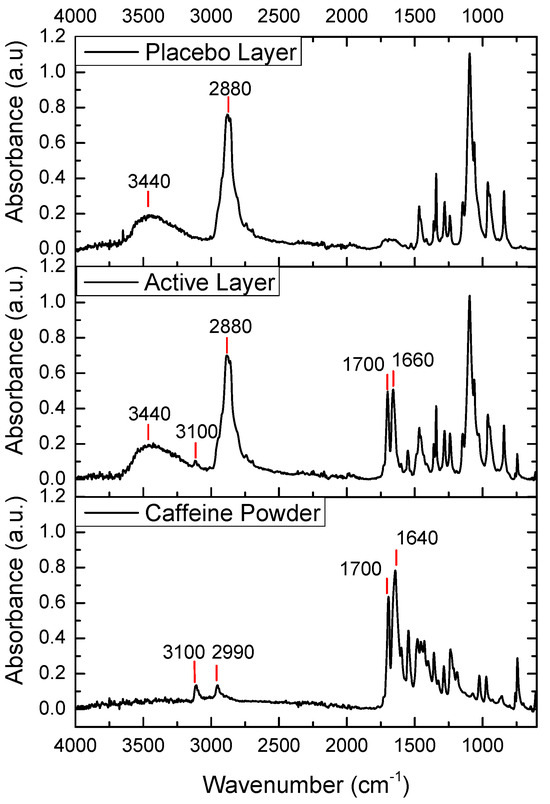The FTIR spectra of pure caffeine, the placebo layer, and the active layer are shown in Figure 4. The FTIR spectrum of caffeine powder showed two peaks at 3110 cm−1 and 2955 cm−1 corresponding to aromatic C-H stretching vibrations. The peak at 1643 cm−1 was due to -C=N ring stretching, and the peak at 1700 cm−1 was attributed to C-O stretching vibration in the cyclic hydrocarbons [33]. In the spectrum of the placebo layer, we observed two strong peaks at 2880 cm−1 and 3440 cm−1, corresponding to C-H bond stretching and O-H stretching vibration, respectively. In the case of the spectrum of the caffeine-containing layer, the main peaks of the placebo-layer components could also be observed, a broad peak at 3440 cm−1 and a peak at 2800 cm−1. Interestingly, the main caffeine peaks mentioned above were also seen, but with the caffeine band exhibiting a stronger relative intensity and shift towards higher wavenumbers at 1640 cm−1. The latter could have been associated with some potential interactions between the caffeine and the excipients in the active layer.