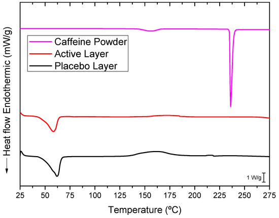 The selected PEO_CAF_PEG_OA active layer and its placebo counterpart were further analyzed to elucidate the physical states of caffeine and the polymer matrix. Figure 5 presents the DSC thermograms of the active layer, the placebo layer (without caffeine), and pure caffeine powder. The thermogram of pure, commercial, as-received caffeine exhibited a sharp and intense endothermic peak at around 236 °C, corresponding to the melting of caffeine crystals. The electrospun PEO_PEG_OA placebo layer displayed a distinct endothermic peak at 61.96 °C with an enthalpy of fusion of 211.43 J/g (normalized to the mass of the PEO in this layer), associated with the melting characteristics of the PEO crystals. Similarly, the caffeine-loaded fibers showed a PEO melting point at 58.54 °C with an enthalpy of fusion of 205 J/g (normalized to the mass of PEO in this layer). A small decrease in the melting point could have been associated with the presence of caffeine; this does not, however, seem to impair the PEO polymer’s crystallization significantly. Interestingly, the melting peak of caffeine was absent in the thermogram of the caffeine-loaded layer. This absence may be attributed to the electrospinning process inducing a high degree of caffeine amorphization within the fibers that did not contribute to a coherent, measurable calorimetric signal. Alternatively, since the melting point of caffeine is much higher than that of PEO, it is possible that any potential caffeine crystals could have dissolved in the molten PEO during the DSC run. Thus, to further investigate the physical state of the drug, WAXS experiments were also conducted on the active layer [29].