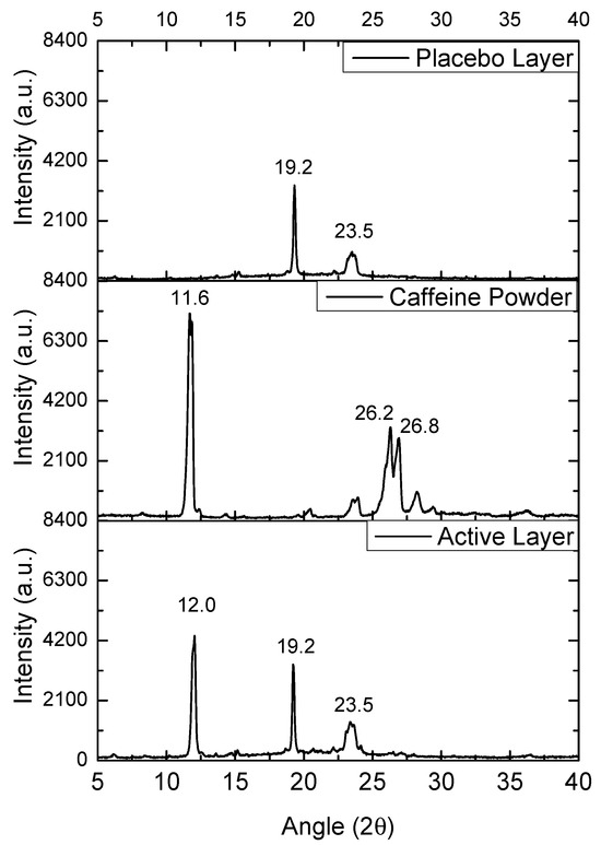 The WAXS patterns of the commercial caffeine powder, the selected PEO_CAF_PEG_OA active layer, and the PEO_PEG_OA fiber placebo layer were analyzed to assess the potential crystalline structure of the materials. Figure 6 shows the diffractograms of the mentioned samples. The placebo layer showed two main peaks at 19.2° and 23.5°, attributed to the orthorhombic phase of PEO. The caffeine powder diffractogram showed several sharp peaks, attributed to the crystalline nature of the supplied drug. The most intense diffraction peak was observed at 11.6°, which was attributed to the (001) crystalline plane, and two other intense crystalline peaks were present at 26.2° and 26.8°, which were clearly ascribable to the most thermodynamically stable polymorph of caffeine, i.e., the β form [34]. In the case of the PEO_CAF_PEG_OA active layer, the peaks corresponding to the orthorhombic phase of PEO were clearly present at the same diffraction angles (19.2° and 23.5°). Interestingly, another peak was observed at 12.0°, which could only be ascribed to caffeine. This observation suggests that although no endothermic signal was observed by DSC, some crystals of caffeine seem to have been created within the fibers. By applying the Scherrer Equation (1) to the only diffraction peak of caffeine, seen at ca. 11.6°, the estimated average crystal size for the as-received powder was around 20 nm, whereas for the active layer it was around 25 nm. So, it appears that within the fibers of the active layer, there existed some very small crystals of caffeine that were highly dispersed and distributed along the fiber mat, which were not detected, as in other compositions of the active layer, by SEM when analyzing the fiber morphology, nor by DSC. The formation of crystals of caffeine during the electrospinning process is rather unusual, as the process typically produces amorphous forms of the API, as previously reported in polyvinyl alcohol (PVOH) and polyvinylpyrrolidone (PVP) [28,29].