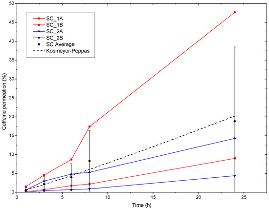 Caffeine permeation through ex vivo human SC specimens of the PCL + PEO_CAF_PEG_OA multilayer patch. SC-1A and B correspond to the SC specimens of the 39-year-old man, and SC-2A and B correspond to the SC specimens of the 68-year-old woman. The SC Average corresponds to the average of all the specimens, and the dotted line corresponds to the fit to the Kosmeyer–Peppas model.