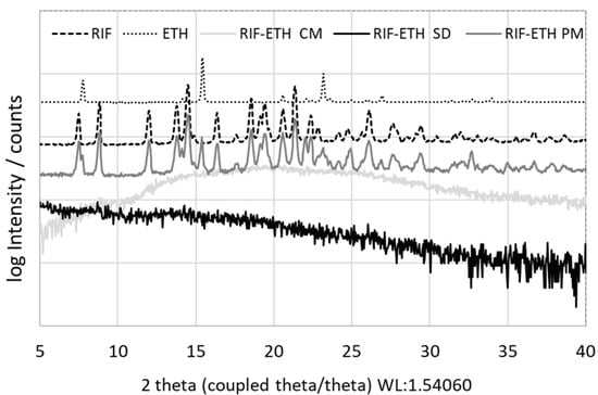 XRD pattern of the starting materials (jet milled RIF and ETH), the physical mixture of RIF and ETH (RIF-ETH PM), the co-amorphous milled (RIF-ETH CM) and spray-dried (RIF-ETH SD) RIF-ETH formulation.