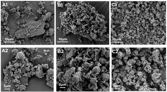 The PM is not completely homogeneous as still particles of the 2 APIs can be distinguished. (SEM images of pure RIF and ETH can be found in the Supplementary Information, Figure S2). ETH exhibits more plate-like elongated particles while RIF shows smaller and more round particles. In Figure 2A1,A2, larger plate-like ETH particles with smaller RIF and ETH particles on the surface are visualized.