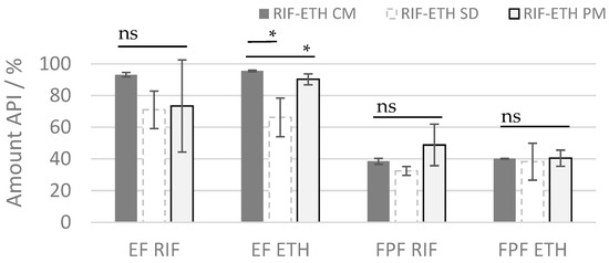 ED and FPF or RIF and ETH for the 3 different formulations (ETH RIF PM, ETH-RIF CM, ETH-RIF SD) (mean ± SD, n = 3), ns: not significant; significant at * p ≤ 0.05.