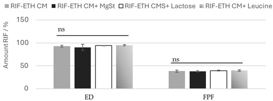 EF and FPF or RIF for ETH-RIF CM with the addition of MgSt, leucine or lactose, (mean ± SD, n = 3), ns: not significant.