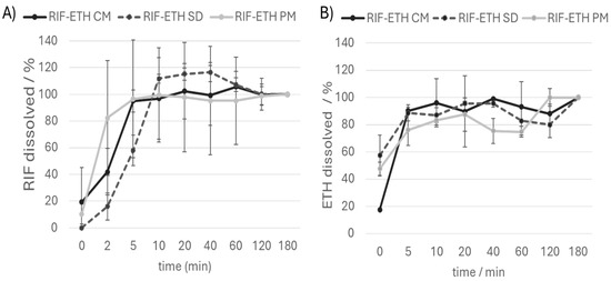 Dissolution curve (amount of (A) RIF and (B) ETH dissolved over time) of the RIF ETH physical mixture (RIF ETH PM), the cryo-milled formulation (RIF-ETH CM) and the spray-dried formulation (RIF-ETH SD), (mean ± SD, n = 3). Values are referred to the dissolved drug amount after 180 min. That amount is set at 100%.