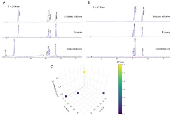 Representative HPLC chromatograms of caffeine, curcumin, capsaicin, and methyl red (75 μg/mL) in standard solution, extracts, and nanoemulsion observed at 280 nm (A) and 450 nm (B). Separation of curcumin and capsaicin peaks represented as retention time difference at various ratios of acetonitrile and methanol (C); color bar indicates retention time difference (min).