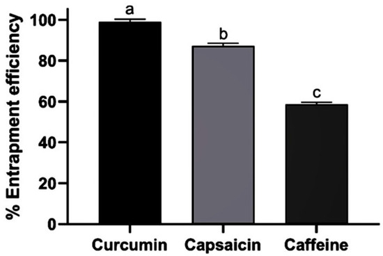 Entrapment efficiencies of curcumin, capsaicin, and caffeine. Values expressed as mean ± SEM (n = 3); a, b, c show significant differences between samples at p < 0.05.