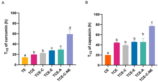 The half–lives of curcumin (A) and capsaicin (B) in turmeric extract (TE), chili extract (CE), turmeric–chili mixture (TCE), turmeric–chili–coffee mixture (TCE-C), turmeric–chili mixture with vitamin E (TCE-E), turmeric–chili mixture with avocado oil (TCE-A) and turmeric–chili–coffee mixture in nanoemulsions (TCE-C-NE). Values are expressed as mean ± SD (n = 3). Different letters (a, b, c, d) indicate significant differences between samples at p < 0.05.