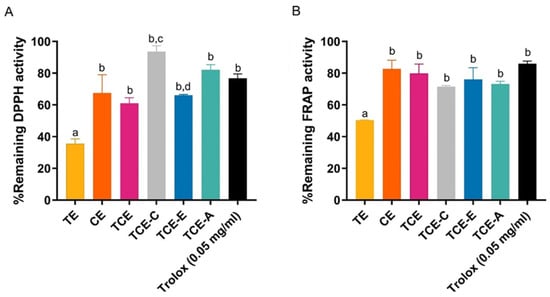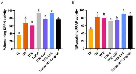 The remaining percentages of antioxidant activity measured (A) by DPPH assay and (B) FRAP assay after 12 h exposure to UV and white light for turmeric extract (TE), chili extract (CE), turmeric–chili mixture (TCE), turmeric–chili–coffee mixture (TCE-C), turmeric–chili mixture with vitamin E (TCE-E), turmeric–chili mixture with avocado oil (TCE-A), and Trolox (50 μg/mL). Values are expressed as mean ± SD (n = 3). Different letters (a, b, c, d) indicate significant differences between samples at p < 0.05.