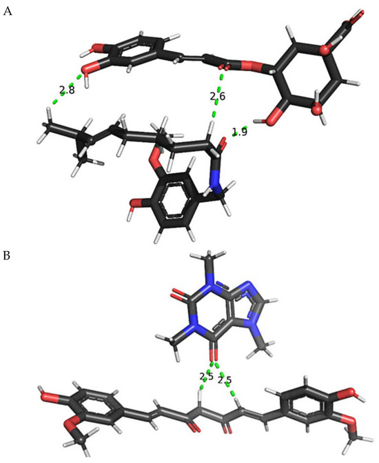 To determine whether the compounds in coffee (caffeine or chlorogenic acid) can stably interact with curcumin or capsaicin, and whether the two active ingredients from turmeric and chili can interact when put together, the interaction energies between each of the two molecules—caffeine–curcumin, caffeine–capsaicin, chlorogenic acid–curcumin, chlorogenic acid–capsaicin, and curcumin–capsaicin—were calculated according to the following formula: