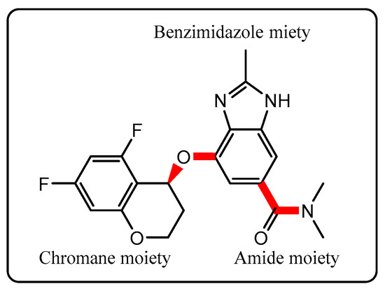 Chemical structure of TPZ ((S)-4-((5,7-difluorochroman-4-yl)oxy)-N,N,2-trimethyl-1H-benzo[d]imidazole-6-carboxamide), with four key rotatable bonds highlighted in red. These flexible sites influence their conformational and polymorphic behavior.