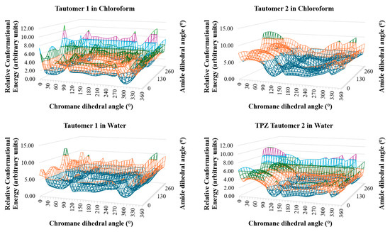 Three-dimensional conformational energy landscapes of TPZ tautomers in chloroform and water. Energy is plotted as a function of chromane and amide dihedral angles. Minima indicate probable solution-phase conformers.