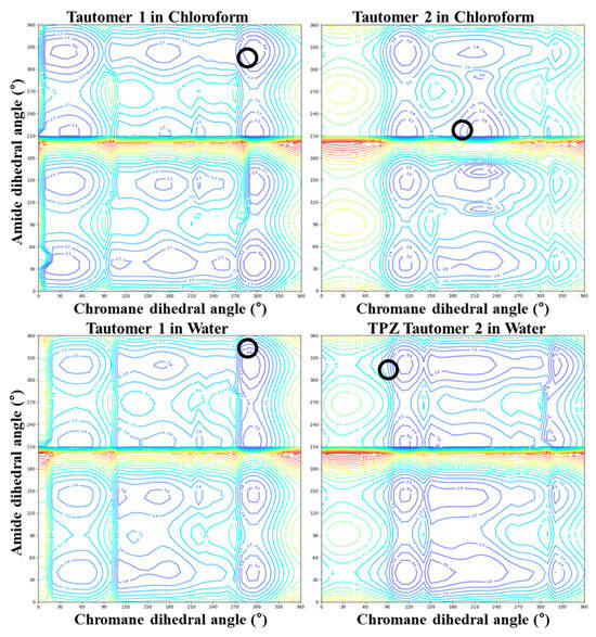 Two-dimensional contour maps of conformational energy for TPZ tautomers in chloroform and water. Black circles indicate the lowest-energy conformers.