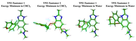 Optimized molecular geometries of the lowest-energy TPZ tautomers in chloroform and water. Atom colors: C (green), N (blue), O (red), and H (light gray).