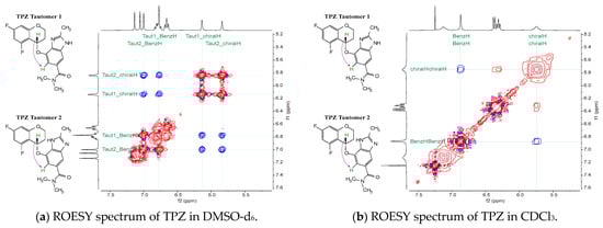 Conversely, the lowest-energy conformer of TPZ tautomer 1 in chloroform adopts an opposite orientation, with the chromane moiety directed toward the imidazole ring and the chiral center hydrogen positioned away from NOE-relevant spatial arrangements. While this geometry shows a general similarity in chromane orientation to the other conformer observed in Polymorph A and the two conformers identified in Polymorph B, it does not perfectly align; as reflected in Table 1, notable dihedral angle differences of approximately 20° to 90° exist between these conformers, underscoring that the correspondence is approximate rather than exact.
